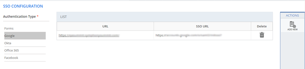 Select Admin > Basic > Infrastructure > SSO Configuration. The SSO CONFIGURATION page is displayed. Select Google and click ADD NEW under ACTIONS panel.