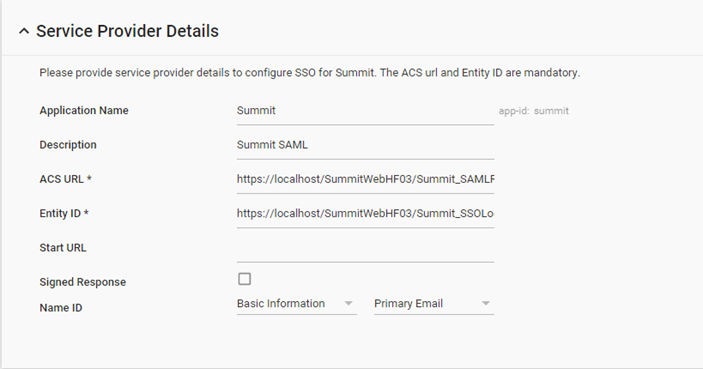 Type in the SSO configuration details. For more information about the fields on the SSO Configuration : Google page, see Field Description.