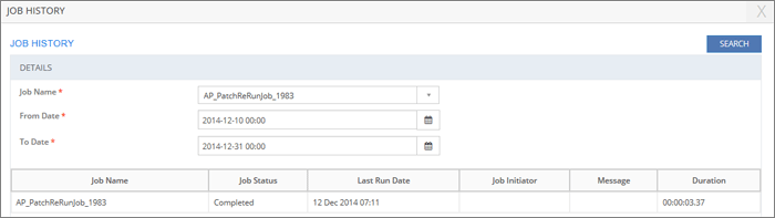 Click HISTORY to view job details, such as Job Name, Job Status, Job Initiator, Message, Duration, and so on. On clicking the HISTORY icon, the JOB HISTORY pop up page is displayed. Specify the filter criteria and click SEARCH button to view job details. The following table describes the fields on the JOB HISTORY page:
