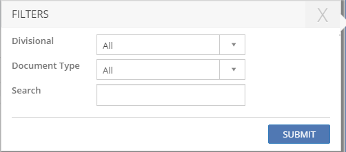 Click the Filters icon to specify a particular filter criteria to display the documents. On clicking the Filters icon, the FILTERS pop-up page is displayed. Select the Divisional, Document Type, and Search keyword and click SUBMIT.