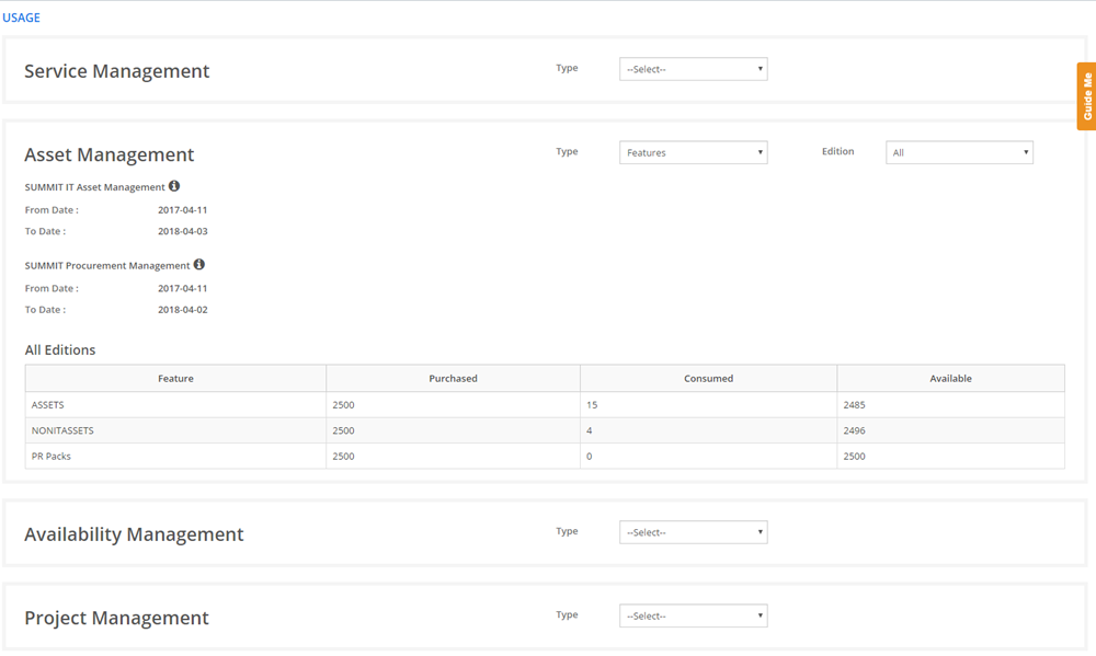 Select Admin > Advanced > License > Usage. The USAGE page is displayed.